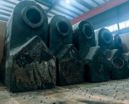 ???????破碎錘(錘頭)是錘式破碎機決定破碎效率和成本的關鍵部件,選擇合適的材質和類型可大幅提高生產效率,降低維護成本。長沙上為根據客戶破碎機型號、物料特性和運行工況合理選擇合適的材質與生產工藝,可最大化設備使用壽命,降低用戶的生產成本。